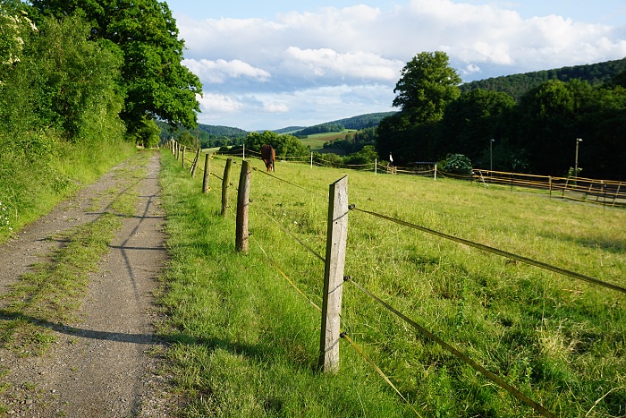 Der erste Aussichtspunkt offenbart einen herrlichen Blick hinunter auf die Eder. Petrus hatte den Hahn netterweise schon wieder zugedreht und so konnten wir die Sicht ausgiebig genießen. Hier wäre ein sehr schöner Pausenplatz, wenn man richtig rasten möchte. Bei rund 10 km Strecke haben wir auf eine längerePause verzichtet. Kaum „über den Berg“ führt die Route abwärts und hinein in ein malerisches Tal mit Pferdeweiden. Mit etwas Glück sind sogar einige Pferde draußen. Für mich natürlich viel eher ein Ort für einen längeren Stopp als oben auf dem Berg.