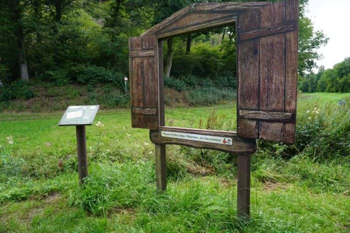 Der Start- oder eben auch Endpunkt der Traumschleife ist dank des Tores mit der Schrift kaum zu übersehen. Überhaupt sind die Traumschleifen unterwegs kaum zu übersehen. Die Traumschleifen gelten als unverlaufbar, was sie ihrer tatsächlich erstklassigen Beschilderung verdanken. Da ich es absolut nicht mag, mich zu verlaufen und dadurch Zusatzkilometer einzusammeln, hatten sie dadurch bei mir gleich einen Stein im Brett. Zunächst führt die Route durch grüne Täler und zwischen hübnschen Wiesen und Weiden hindurch. Gelegentlich trifft man auf hölzerne Rahmen. Hier bietet der „Durchblick“ eine ganz besonders schöne Sicht.
