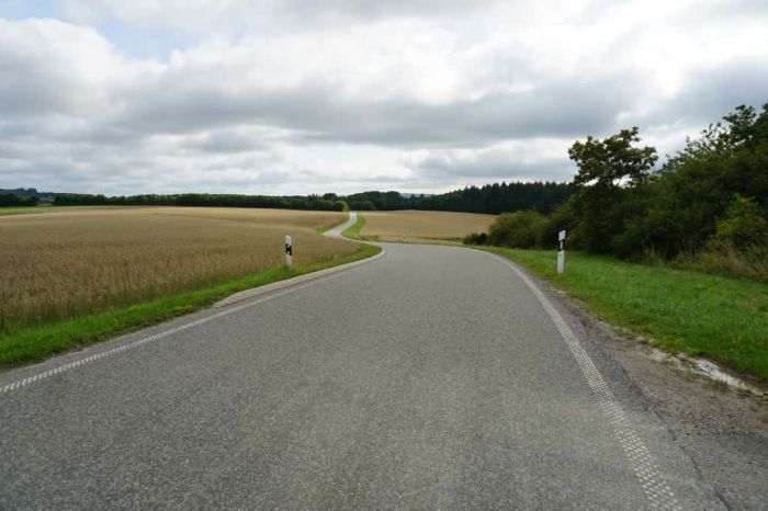 Das „Lecker Pfädchen“ bietet bald aber auch Wald, was mich natürlich besonders gefreut hat. Nichts gegen Felder und Wiesen, aber der Wald geht bei mir doch darüber. Obwohl man oft auf schmalen Singletrails läuft, sind sie geländemäßig ganz entspannt zu gehen. Das schafft jeder. So kann man die Landschaft voll genießen. Schließlich gilt es, eine Straße zu überqueren. Sei bitte unbedingt vorsichtig dabei, aber wenn es der Verkehr zulässt, dann stell‘ dich mitten auf die Straße und folge mit den Augen ihrem schlängeligen Verlauf. Das sieht richtig lustig aus! An unserem Wandertag war zum Glück wenig los, da hat das ganz gut funktioniert.