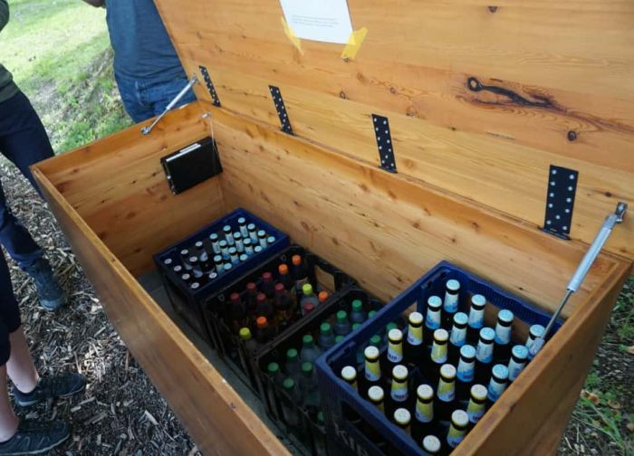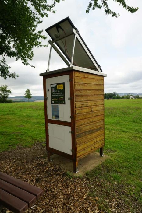 Wenn es etwas gibt, was man auf den Traumschleifen besonders gut kann, dann ist es rasten! Alleine auf dem mittellangen „Lecker Pfädchen“ bieten drei Genussstationen „Ebbes von hei“ (Etwas von hier). Lokale Anbieter von Getränken haben sich dafür zusammengeschlossen und bieten an den Stationen teilweise sogar gekühlte Getränke an. Darunter Limo, Schorle, Eistee, aber auch Bier und Wein. An alkoholische Getränke kommt man nur mit elektronischer Ausweiskontrolle heran, versteht sich. Ein Führerschein tut es genauso. Preislisten hängen aus und es versteht sich von selbst, dass man eine Kasse des Vertrauens nicht betrügt, oder? Ich hoffe sehr, dass diese Genussstationen nicht irgendwann Vandalen zum Opfer fallen. Das wäre so schade. Es wird an den Stationen übrigens Bargeld benötigt. An digitalen Zahlungsmöglichkeiten wird noch gearbeitet.