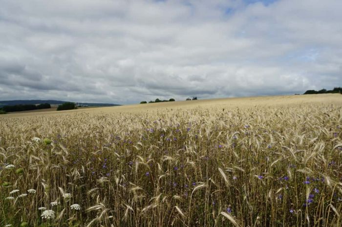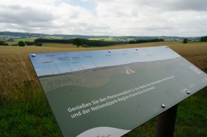 Frisch gestärkt gelangt man bald nach der Genussstation zu einem der Aussichtspunkte. Von hier aus reicht der Blick weit ins Land über die sanften Hügel bis zum nächsten kleinen Ort. Eine Tafel vor Ort klärt darüber auf, auf was man genau schaut. Das ist nützlich! Im August leuchtete dazu noch das Korn auf den Feldern. Ein großartiger Anblick und eine feine Abwechslung zu dem vielen Grün. Der Weg ist nun etwas schotterig, dürfte aber weiterhin niemandem ernstlich Schwierigkeiten bereiten. Echte Anstiege hat man nachwievor nicht zu bewältigen, das leichte Auf undab läuft sich herrlich entspannt. Leider braute sich etwa in dieser Ecke etwas Dunkles und Regnerisches über uns zusammen. So richtig wollte das Wetter auch an diesem zweiten Tag des Bloggerwanderns nicht mitspielen.