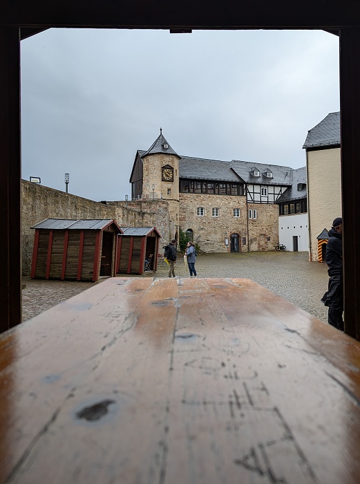 Selbiges erwischte uns kurz unterhalb der Burg, wo wir uns zunächst mit anderen Leuten unter das Dach vom Toilettenhäuschen drängten. Dieses Mal ging wirklich glatt die Welt unter, so sehr schüttete es. Wahnsinn! Als es endlich etwas nachließ, sind wir die letzten Meter zur Burg gelaufen. Maiks Laune hing zu diesem Zeitpunkt ähnlich tief wie meine am Tag zuvor. Zum Glück gab es an der Burg eine Bude, die uA Currywurst und Pommes im Angebot hatte. In einer kleinen hölzernen Hütte mit Tisch und Bänken haben wir es uns erstmal in Ruhe schmecken lassen. Der Weltuntergang war zurück und zog sich nervig in die Länge. Da muss man ja nicht drin herum wandern, wenn man genauso gut unter einem Dach sitzen kann.