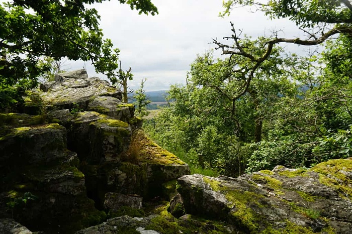 Die Kirschweiler Festung liegt deutlich erhöht, entsprechend sind auf dem Weg dorthin einige Höhenmeter zu bewältigen. Es hält sich aber in erträglichem Rahmen und man kommt auf den Wegen und Pfaden gut voran. Wer mag, der kann es sich mit Wanderstöcken etwas leichter machen. Erstes Geröll kündete schließlich davon, dass die Festung nun nicht mehr weit war.