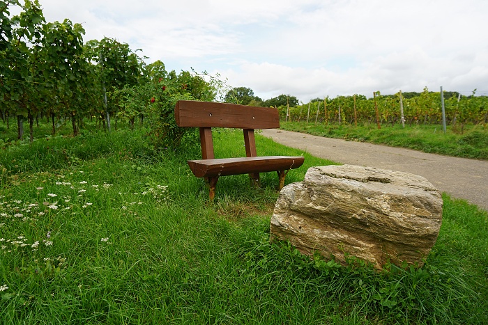 Gestartet sind wir an der Bushaltestelle Geisenheim-Johannisberg, Rosenstraße, die für den Etappenstart prima gelegen ist. Für wenige Meter läuft man noch ortsnah, dann führt die Route bereits in die Weinberge, die man nun eine ganze Weile an der Seite hat. Zur passenden Jahreszeit kann man leicht zwei, drei Trauben naschen. Ich persönlich laufe sehr gerne durch Weinberge. Ich mag die ordentlich angelegten Wege und den Blick in die Weinhänge. Außerdem bieten Weinberge oft eine schöne Aussicht. Darauf muss man hier allerdings noch verzichten. Aber das kommt später, versprochen!