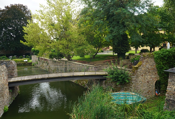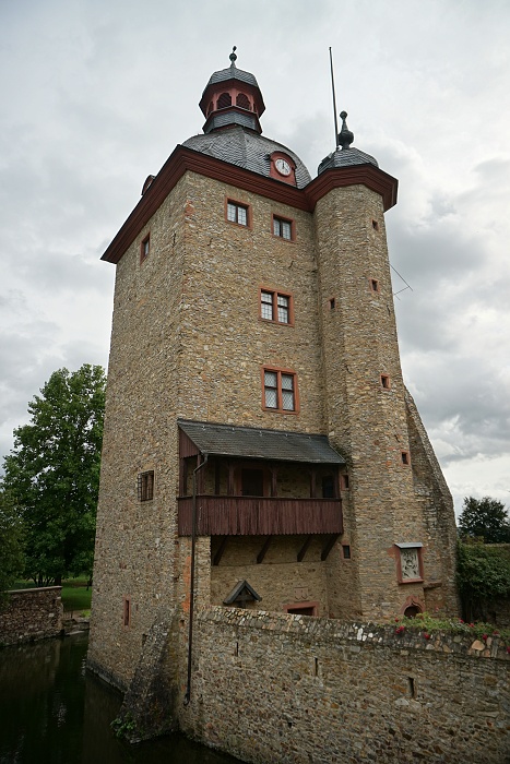 Nach einigen Kilometern blitzt der Wasserturm von Schloss Vollrads durch die Bäume. Das Schloss ist heute ein Weingut und beherbergt daher natürlich eine Vinothek. Im Innenhof gibt es je nach Jahreszeit einen kleinen Ausschank und man kann sich gemütlich ein Glas Wein schmecken lassen. Ein kleiner Rundgang lohnt sich ebenfalls, der „Garten“ ist recht malerisch hergerichtet. Falls nötig, so gibt es am Schloss außerdem eine Toilette, die man nutzen darf. Ich bin kein Kulturbanause, aber eine solche Einrichtung ist mir manchmal mehr wert als Historie.