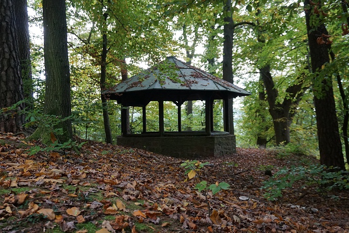 Für die ersten zwei Kilometer bleibt man im Ort und hat festen Untergrund unter den Schuhen. Zu Beginn einer Tour stört mich das wenig. Außerdem gibt es in Höchst gut Ablenkung durch einige hübsche Fachwerkhäuser. So sind die ersten beiden Kilometer gut zu meistern. Schließlich gelangt man in den Wald und bald schon kommt eine hübsche Rasthütte in Sicht, die unter der Namen „Schillertempel“ bekannt ist. Eine grobe Treppe führt zur Hütte hinauf. Uns war es an dieser Stelle noch zu früh für eine Rast. Meistens machen wir unsere Pause auf halber Strecke einer Wanderung. Das hat sich bisher sehr gut bewährt.