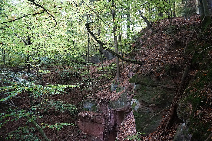 Etwas später führt ein Abstecher zum im Wald versteckten ehemaligen Sandbacher Steinbruch. Es führt ein Trampelpfad an den Rand, dennoch ist hier Vorsicht geboten. Der Steinbruch ist bis an die Abbruchkanten zugewachsen und komplett ungesichert. Mit Vorsicht kann man an der Kante entlanggehen, aber es geht dort tatsächlich mehrere Meter senkrecht nach unten. Also pass bitte gut auf, wohin du trittst. Der Abstieg in den Steinbruch ist ebenfalls möglich. Es gibt einen Abschnitt, wo das Gelände nicht so abschüssig ist. Trotzdem, sei lieber vorsichtig! Es soll im Steinbruch auch Höhlen geben. Ich selber war nicht unten, Maik schon. Er meinte, er hätte keine Höhle gesehen.