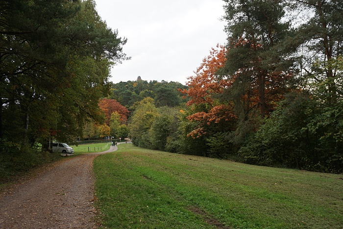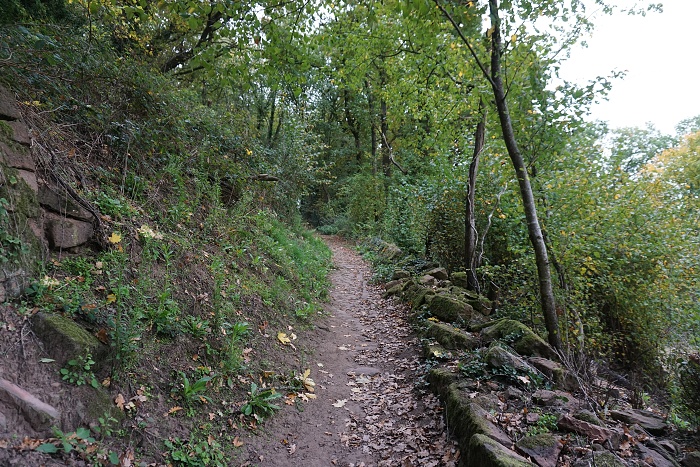 Dieses Mal sind wir einmal um die Burg herumgegangen. Auf der anderen Seite kann man -wenn man möchte- die Rutsche ausprobieren, die natürlich vor allem für den Nachwuchs ein Highlight ist. Sie macht aber auch als Erwachsener Spass, das haben wir 2023 getestet. Anschließend führt die Strecke über einen urigen Hohlweg abwärts und an einer hölzernen Aussichtsplattform vorbei. Vor zwei Jahen hatten wir von der Plattform aus einen großartigen Blick, jetzt im Oktober war das leider nicht ganz so dolle. Einen kurzen Stopp ist die Plattform aber allemal wert.