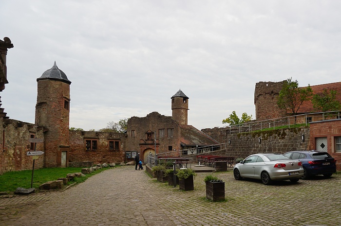 In Richtung der Burg wurde es auf den Wegen immer voller. Zuvor waren wir so gut wie niemandem begegnet. Aber Burg Breuberg ist natürlich nicht nur ein ideales Ziel für Wanderer, sondern auch für Ausflügler jeglicher Art. Die Burg ist eine Höhenburg und entstand kurz nach 1200. Sie ist sehr gut erhalten, obwohl sie eine bewegte Vergangenheit und mehrere Besitzerwechsel erlebt hat. Heute gibt es auf der Burg eine Jugendherberge und das Breuberg-Museum. Außerdem kann man hinauf auf den Turm, was wir bei unserem ersten Besuch 2023 gemacht haben. Der Ausblick kann sich sehen lassen! Damals kostete der Aufstieg pro Nase nur € 1,00. Ob das immer noch so ist, haben wir auf dieser Runde nicht geprüft.