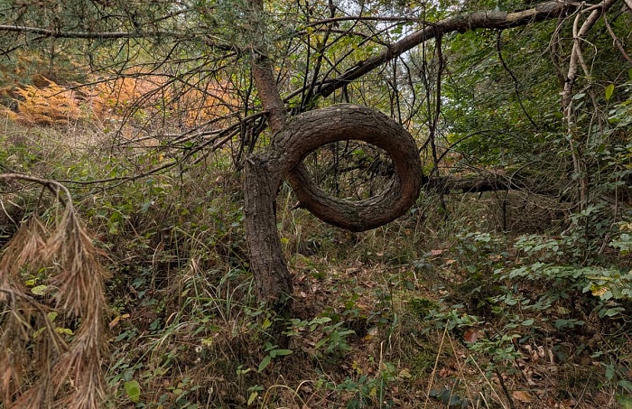 Die rund 420 Höhenmeter der Wanderung verteilen sich ausgesprochen angenehm. Es geht zwar schön im Wechsel auf und ab, aber niemals so sehr, dass es sonderlich anstrengend wäre. Die Wege sind bequem zu gehen und überwiegend echte Wanderwege. Auch damit sollte fast jeder zurechtkommen. Am Wegesrand gibt es immer mal wieder kleinere Kuriositäten zu sehen, wie etwa einen komplett im Kreis gewachsenen Baumstamm. Fast wären wir daran vorbeigelaufen, dabei ist das wirklich sehenswert. Die Natur schafft alles und lässt enen regelmäßig staunen. Natürlich gibt es krumm und schief gewachsene Bäume, aber solch einen Wuchs hätte ich einem Baumstamm doch nicht zugetraut.