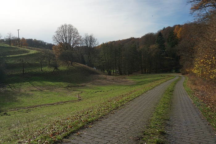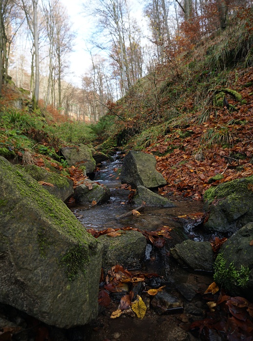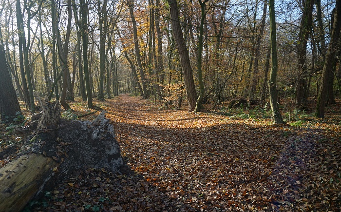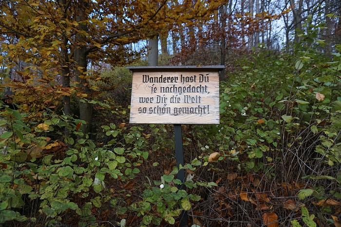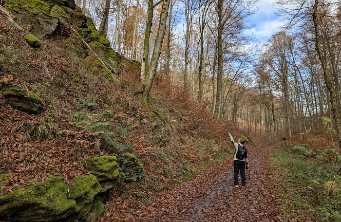 Vom Bahnhof „Rückersbacher Schlucht“ aus waren es nur wenige Wanderminuten und schon standen wir im Wald auf einem breiten Weg, der Mitte November noch die schönsten Herbstfarben trug. Ausnahmsweise schien an diesem Wandertag sogar die Sonne. was kann man sich mehr wünschen? Okay, wenige Höhenmeter vielleicht noch. Die liegen hier bei dieser Runde im unteren Mittelfeld. Quälen muss man sich also nirgends und die Wege sind alle (bis auf ein kurzes Stück) alle leicht zu gehen. Eine Sonntagstour aus dem Bilderbuch also, wenn man von diesen Eckdaten ausgeht.