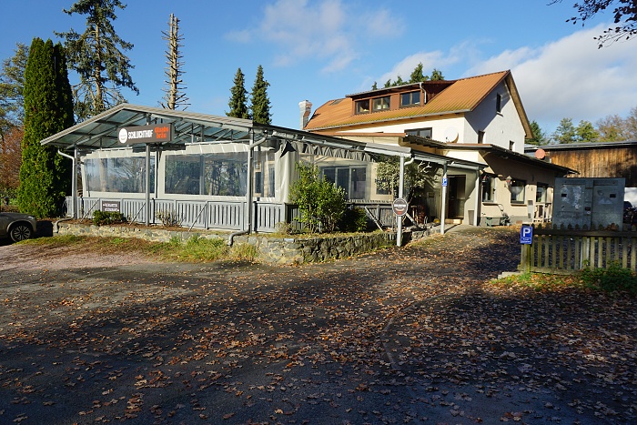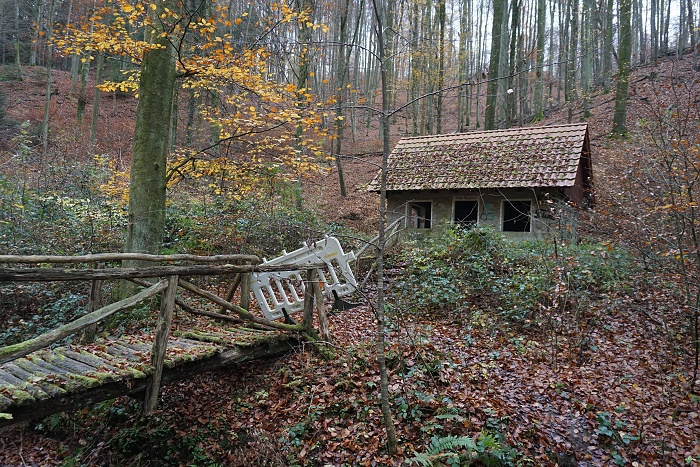 Für die Verpflegung ist ebenfalls gut gesorgt! Noch recht nahe beim Startpunkt erwartet einen bereits das erste Lokal, der Schluchthof. Der hatte noch nicht geöffnet als wir dort ankamen. Es wäre auch deutlich zu früh gewesen für eine ausgedehnte Pause, also sind wir am Lokal vorbei gelaufen und waren bald wieder im Wald. Dort kommt nach eine Weile ein kleines Häuschen in Sicht, zu dem eine klapprige Holzbrücke führt. Im November war diese abgesperrt. Wir hätten uns das Hexenhaus gerne einmal angeschaut, halt an der Sperre seitlich vorbei, aber leider waren wir zum dem Zeitpunkt nicht alleine auf diesem Weg. Wobei man andererseits sagen muss, es hätte wohl sowieso nichts mehr zu sehen gegeben. Wie es sich liest, ist es ein Gebäude des ehemaligen Steinbruchs,