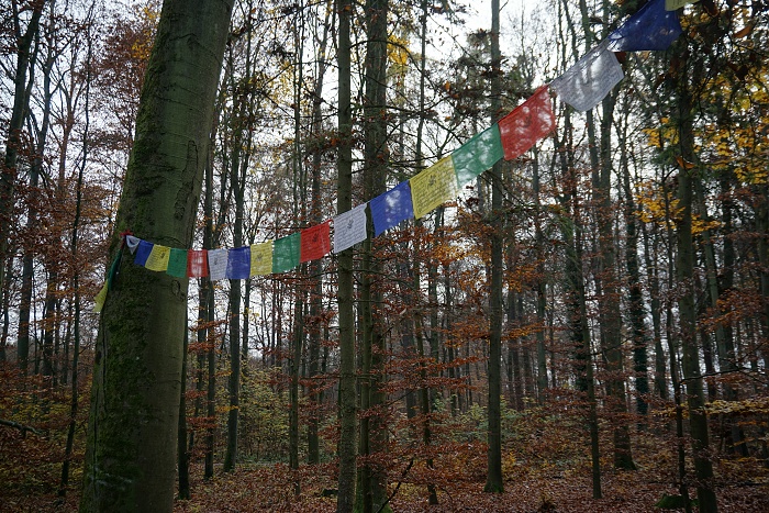 Die bunten Girlanden so mitten im Wald haben uns ebenfalls überrascht. Jedes Fähnchen war in feinstem Sanskrit mit Sinnesprüchen beschrieben. Verstanden haben wi natülich nichts davon. Mich hat das ein wenig an Klein Tibet in den Tiroler Alpen erinnert. Was das hier im Wald im Spessart zu bedeuten hatte, das wissen wir bis heute nicht. Aber es ist auf jeden Fall etwas, das man hier auf keinen Fall erwartet. Entsprechend haben wir uns hier etwas länger aufgehalten, ehe wir weitermarschiert sind.