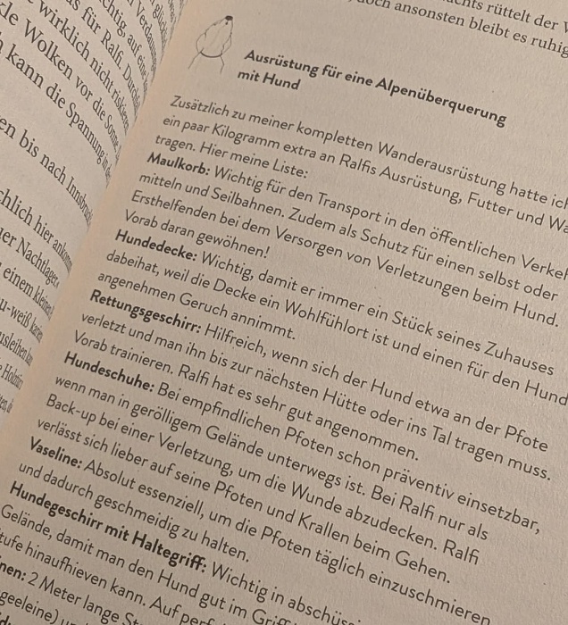 Sehr vielen Kapiteln sind nochmal ein oder zwei Seiten mit praktischen Tipps für das Wandern mit Hund angehängt, speziell bei so großen Wanderungen wie eine Alpenüberquerung. Hat man selbst einen Hund und möchte mit ihm eine größere Tour unternehemen, dann findet man hier eine ganze Menge sehr guter Tipps. Vom Training für eine große Wanderung über Tipps bei Wildtierbegegnungen bis hin zu nötigen Versicherungen und anderen Formalitäten ist alles dabei.