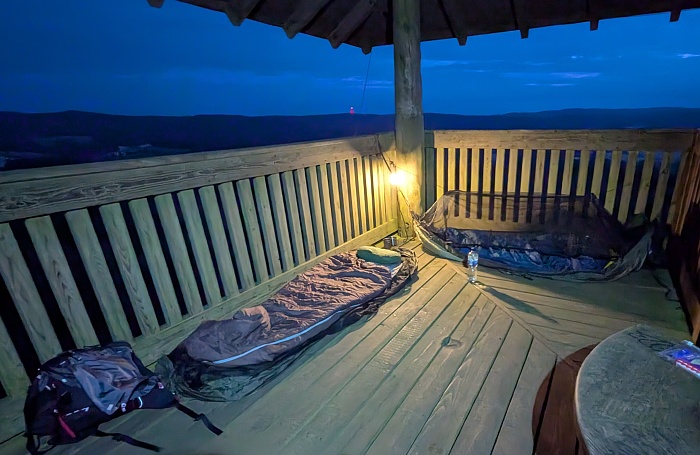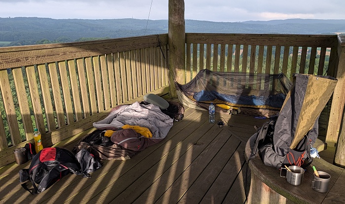 Für diese Nacht war gar kein Regen angesagt gewesen und zudem hatten wir ein solides Dach über dem Kopf. So fielen die Schlafplätze ausnahmsweise sehr luftig aus. Maik begnügte isch mit der Isomatte, dem Schlafsack und einem Kissen. Für mich war meine Hängematte als Bodenkonstruktion errichtet worden, praktischer Mückenschutz durch das Netz inklusive. Darin ebenfalls Schlafsack, Isomatte und Kissen.
