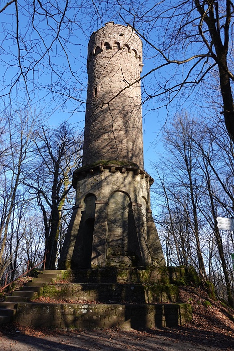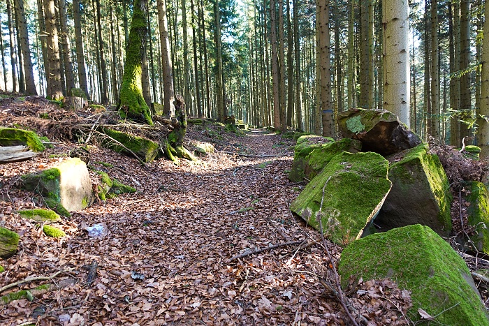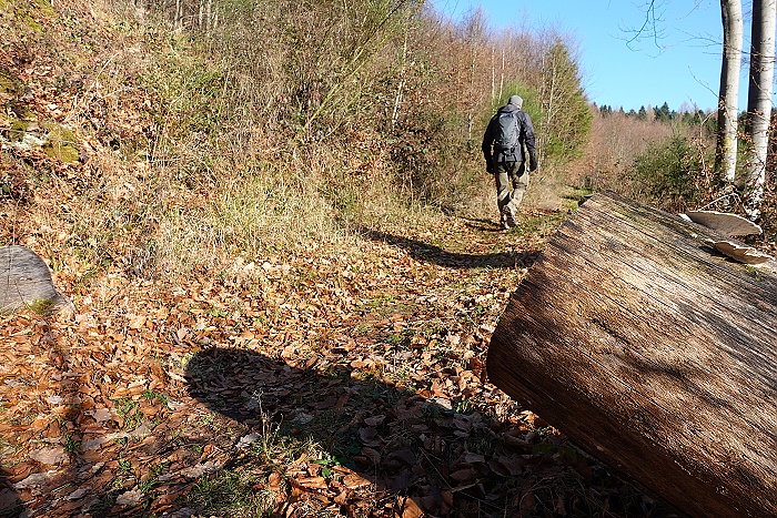 Hat man sich an der Ruine ausreichend umgeschaut und den Blick bis hinunter zum Neckar genossen,führt die Route auf einem breiten Wanderweg weiter. Für eine Weile kommt sie ohne weitere Höhenmeter aus, was sich am steinernen Wegweiser bereits wieder ändert. Noch ist man nicht auf dem Gipfel und das spürt man auch. An unserem Wandertag, dem 1. Weihnachtsfeiertag 2025, war es ganz schön kalt und so war selbst ich froh über die Aufstiege. Die Anstrengung hält nämlich wunderbar warm. Während des Aufstieg ist der Weg eine Ecke rumpeliger mit größeren und kleineren Steinen, die man unter dem Laub kaum bis gar nicht sehen konnte. Ich bin dort prompt gestolpert und auf die Nase gefallen. Aber es ist nichts weiter passiert.