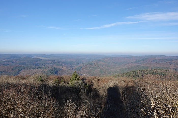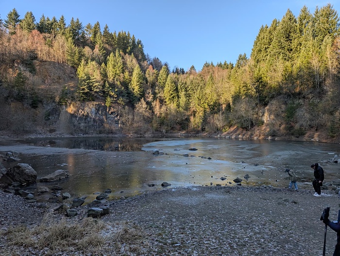 Wie eingangs bereits geschrieben, handelt es sich beim Katzenbuckelsee um einen ehemaligen Steinbruch. Er liegt herrlich auf einem kurze Abstecher von der Route zum Aussichtsturm und umgeben von Bäumen und steilen Felswänden. Im Dezember war er zugefroren und an dem kleine Steinstrand war es im Schatten so richtig kalt. Dennoch war einiges los, was aber kein Wunder ist. Damit muss man hier rechnen, so schön wie es ist. Bis 1974 wurde hier noch das Katzenbuckelgestein abgebaut, das Basalt ähnelt. Nach Schließung des Steinbruchs hat die Natur das Gelände zurückerobert