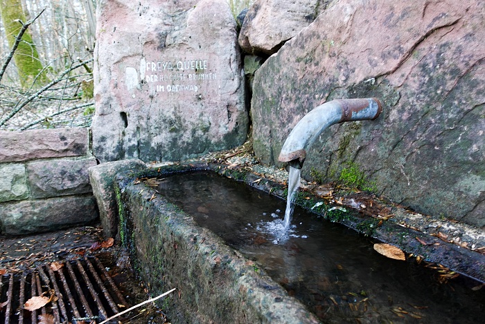 .Vom Turm herunter geht es quasi direkt in den Abstieg und leider zunächst auf eine eher zähe Wanderautobahn, an der es vorerst nichts weiter zu sehen gibt. Das ist zwar gut fürs Lauftempo, ansonsten aber wenig unterhaltsam. Schließlich kommt links vom Weg eine große Hütte in Sicht, eine richtig große Hütte sogar! Es ist die Freya Hütte, direkt bei der Freya Quelle. Der Name rührt von einer Sage her, gemäß derer hier einst die Seherin Freya lebte. An der Hütte gibt es eine Grillstelle und mehrere Sitzgelegenheiten. Es ist der ideale Platz für eine größere Pause. Die Hütte selber ist aber verschlossen. Soweit ich gelesen habe, kann man sie mieten. Da muss ich mich nochmal kundig machen.