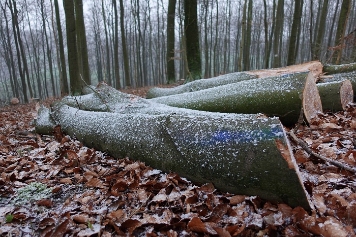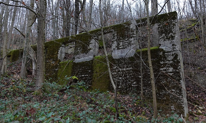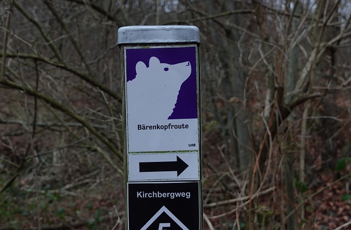 Direkt am Parkplatz schickt ein Schild einen auf die Bärenkopfroute und damit in den Wald. Bergauf geht es hier ebenfalls schon. Die ersten Meter kannten wir noch aus 2024, aber damals haben wir sehr früh abgebrochen, daher waren wir bald auf bisher unbekannten Wegen unterwegs. Am Wegesrand tauchte eine gemauerte Wand auf, quasi eine einzelne Wand von einem Gebäude. Einst gab es hier einen Steinbruch und sogar heute sieht ma noch einige Relikte. Wir haben überlegt, aber es wirkte nicht so als lohne sich eine nähere Erkundung. Außerdem wäre es eine ungemütliche Durchschlageübung gewesen um zur Mauer zu kommen. Dafür war es zu früh.