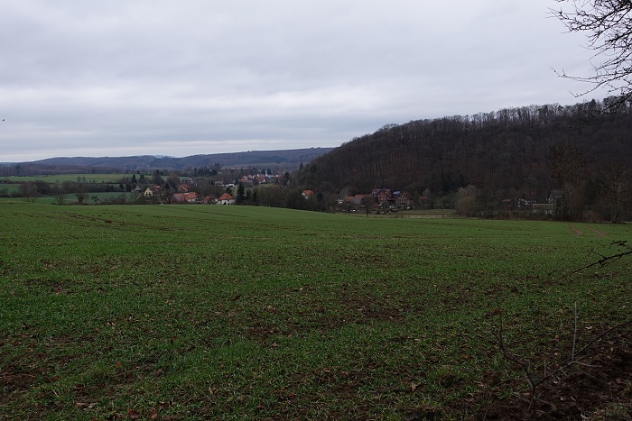 An einem Feld entlang und über einen Trampelpfad bietet sich bald der Blick auf Langenholzhausen, das an diesem Neujahrstag still und verträumt in der Landschaft lag. Überhaupt haben wir auf dieser Runde lediglich am Parkplatz jemanden gesehen, ansonsten waren wir gefühlt alleine unterwegs. Erst als wir schon wieder im Anlauf auf den Parkplatz waren, begegneten uns einige Gassigänger. Lippe startete ruhig ins neue Jahr. Im Kalletal kann ich noch eine weitere Wadnerung empfehlen, die zur Windmühle Bavenhausen führt und mit 11 km etwas länger ist als unsere Runde zum Bärenkopf.