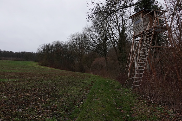 Nun steht der Aufstieg auf den Bärenkopf an. Zunächst läuft man noch entspannt zwischen Feldern entlang und durch einen urigen Hohlweg. Auf dem Abschnitt liegt die hübsche Rotenbergbaude, die aber leider verschlossen war. Sehr schade, wirklich, wir hätten sie für unsere Trinkpause gut brauchen können. Das Wetter war an diesem Tag komplett ungemütlich, düster, eisig kalt und mächtig windig. Selbst hinter der Hütte fanden wir kaum Schutz vor der Witterung, also fiel die Trinkpause ziemlich kurz aus. Später sollte es sogar noch Schnee geben, wenn man der App Glauben schenken wollte.
