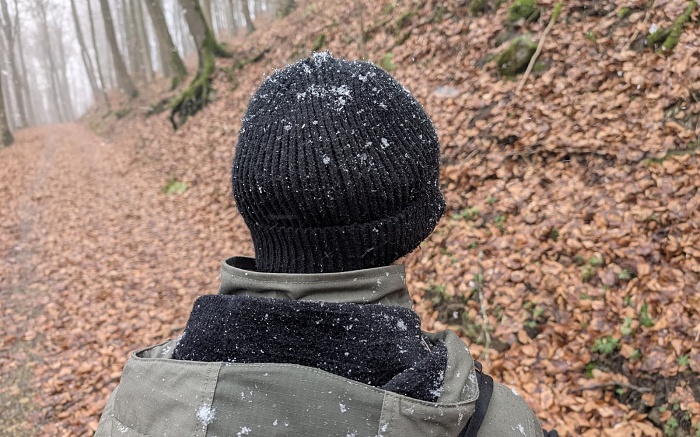Kaum oben angekommen, begann es zu Kälte und Wind auch noch leicht zu flocken. Der Schnee kam so pünktlich wie die Maurer. Wir haben uns also auch hier am Stein nicht lange aufgehalten und auf dem Rückweg wurde es prompt mehr mit dem Schnee. „Damals“ haben wir uns über die ersten Flocken gefreut. Da wusste noch niemand, wieviel Schnee wir in diesem Winter noch sehen würden.