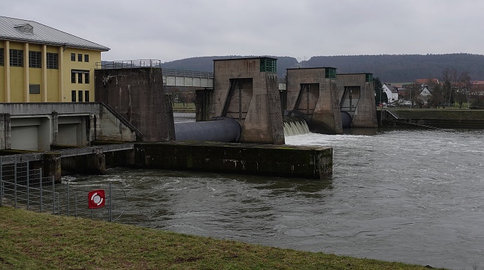 An der Schleuse Steinbach mit dem Wehr herrschte kurz Ratlosigkeit, denn die Route wollte uns über das Wehr auf die andere Mainseite führen. Es war aber vor Ort zunächst keine Möglichkeit zur Überquerung zu sehen. Man muss quasi zur Rückeite der Schleuse gehen und einmal um die Ecke, dann steht man vor der Metalltreppe, die auf die Brücke führt.