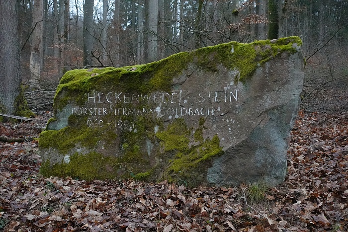 Auf der anderen Seite vom Main angekommen zweigt die Route bald in den Wald ab. Dort geht es direkt satt bergauf! Ziel ist der Heckenwedelstein. Was für ein verrückter Name! Der Stein liegt hier zur Erinnerung an den Förster Hermann Goldbach. Sonderlich groß ist der Stein zwar nicht, übersehen kann man ihn trotzdem nicht.
