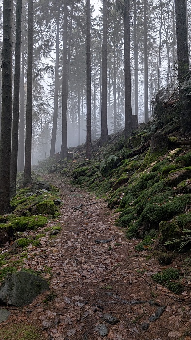 Da die Tour bereits auf einer gewissen Höhe startet, hat sie erfreulich wenige Höhenmeter im Gepäck. Es geht zwar dann und wann aufwärts, aber in einem vertretbaren Maß. Das dürfte jeder schaffen, der die Strecke nicht als allererste Wanderung antritt. Mir kommt das sowieso immer entgegen. Die Wege können sich sehen lassen und so sorgte das mistige Wetter immerhin für ein gewisses Flair. Da liefen sich die ersten Kilometer recht leicht weg. Auf Sehenswertes am Wegesrand muss man dieses Mal überwiegend verzichten und stattdessen die Wanderkulisse auf sich wirken lassen. Außerdem kommt man natürlich gut und zügig voran!