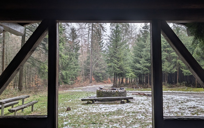 An der großen Eichwaldhütte haben wir eine erste kurze Rast eingelegt um einmal im Trockenen etwas trinken zu können. Die Hütte ist wirklich geräumig, hübsch und hat sogar eine Feuerstelle mit Tischen und Bänken vor der nicht vorhandenen Tür. An sich wäre die Hütte auch etwas für eine Übernachtung draußen. Der ebene Platz würde sich sicher eignen und im Falle von Regen könnte man in die Hütte wechseln. Leider liegt sie aber direkt am Weg, was weniger vorteilhaft ist. Als wir dort vorbeikamen lag außerdem noch ein kleines bisschen Schnee, da war sowieso kein ernsthafter Gedanke daran. Aber ein schöner Platz für eine Trinkpause war die Hütte mit ihrer herrlichen Lage auf jeden Fall.
