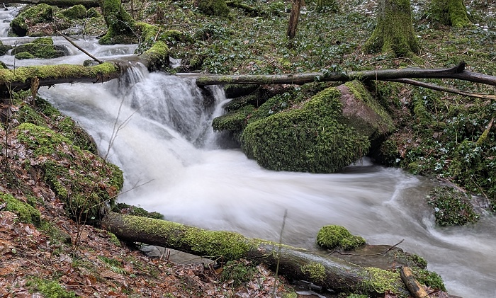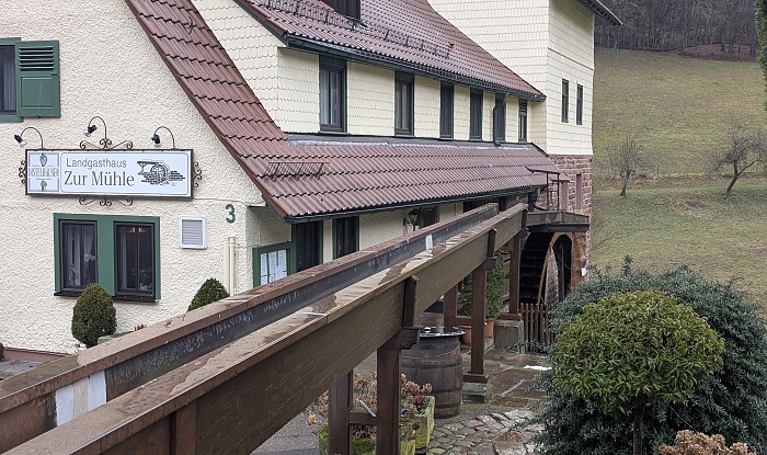 Auf halber Strecke im folgenden Abstieg liegt der Wanderparkplatz Eichwald, der einigen Autos ein schattiges Plätzchen bietet. Auch von hier aus lassen sich verschiedene Wanderungen antreten. Dafür hat man aber nun auch für eine kurze Weile festen Untergrund unter den Sohlen. Das ändert sich aber bald wieder. Nur noch kurz am Landgasthaus „Zur Mühle“ vorbei, wo man gut das große Mühlrad bewundern kann. Über eine hölzerne Rinne fließt Wasser zur Mühle, was wirklich sehenswert ist. Dem Höllbach begegnet man hier zum ersten Mal und folgt ihm auf der weiteren Strecke, wo er sich langsam zu einem echten Wildwasserbach entwickelt Jedenfalls zu solch einer regnerischen Zeit. Sogar Wasserfälle gibt es!