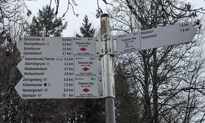 Der Startpunkt an diesem Wandertag war die Bushaltestelle Waldkatzenbach Ort, die wir vom Bahnhof Eberbach aus sogar am Wochenende erreichen konnten. Erstaunlich, was auf dieser Seite des Neckars alles möglich ist! Zunächst führt die Strecke kurz durch den kleinen Ort. Wir hatten an diesem Tag überhaupt kein ordentliches Wetter erwischt, es hat die komplette Tour hindurch geregnet. Das waren zwar die idealen Voraussetzungen, um meine neue Regenhaube für den Rucksack zu testen, ansonsten hat es hauptsächlich genervt. Wenig später im Wald wurde es etwas besser, weil der Regen nicht so richtig durch das Geäst kam, aber angenehm war es keine einzige Minute.
