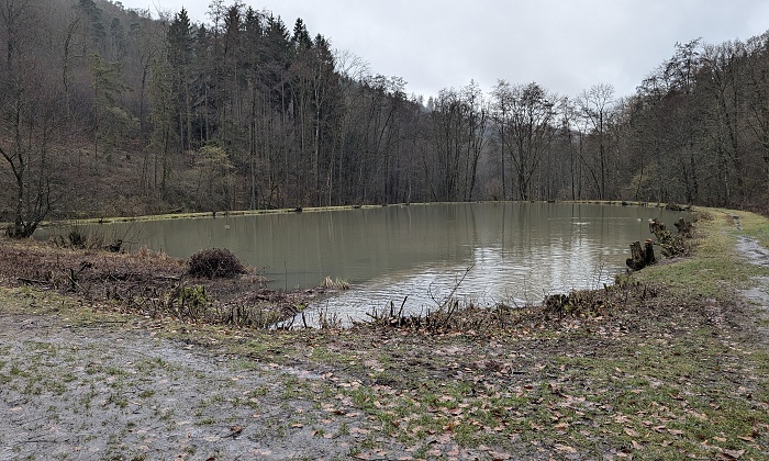 Endlich von der Straße herunter ist man wieder geschützter im Wald unterwegs und zurück auf den weichen Wegen. Das tat nach dem Stück Straße richtig gut! Am kleinen Waldsee kann man nochmal gut eine Pause einlegen. Auch hier gibt es eine geräumige Hütte bzw einen Unterstand, der bei schlechtem Wetter Schutz bietet. Tische und Bänke sind ebenfalls vorhanden und der See liegt wirklich ganz idyllisch. In der Nähe konnten wir sogar die ersten Schneeglöckchen der Saison entdecken. Die ersten zarten Anzeichen dafür, dass der Frühling in den Startlöchern stand. Auch wenn man es diesem Tag Ende Februar überhaupt nicht glauben wollte. Es fühlte sich eher an wie Mitte November.