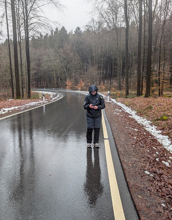 Dass ein Stück der Route auf einer richtigen Landstraße verläuft, das war uns bei der Planung gar nicht aufgefallen. Hier ist ein wenig Vorsicht geboten. Die Straße ist recht kurvig. Mancher Autofahrer sieht das scheinbar als sportliche Herausforderung und wähnt sich auf einer Rennstrecke. Man sollte also immer schön am Straßenrand laufen! Lang ist der Abschnitt nicht, aber irgendwie haben wir ihn komoot nicht abgenommen. Dieser Verein kann bei der Routenplanung einfach nicht ohne die eine oder andere Frechheit! Da half auch der zweifelnde Blick auf die Karte leider wenig. Außerdem waren wir auf der Straße natürlich komplett dem Regen ausgeliefert.