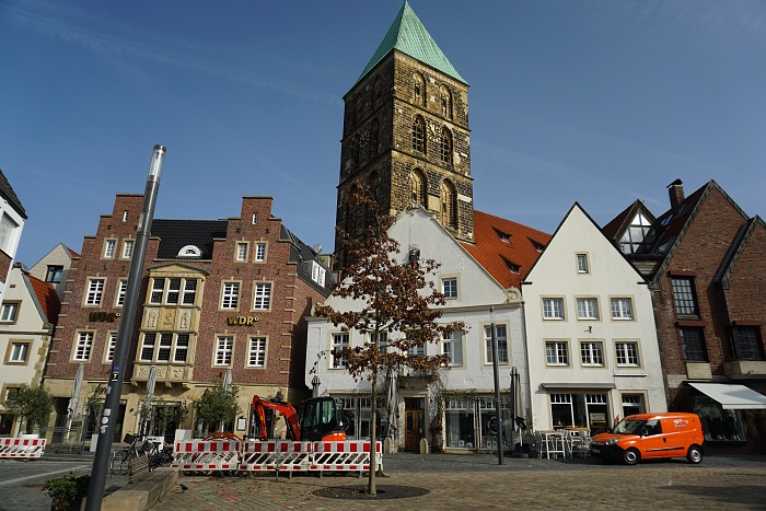 Zu Beginn führt die Etappe durch Rheines Zentrum. Wir bzw ich waren schon häufiger hier, aber fast jedes Mal ging es mt dem Bus noch ein Stück weiter. Daher kannten wir Rheines Innenstadt noch gar nicht. Uns hat das Zentrum prima gefallen. Ein hübscher Ort, den wir sehr wahrscheinlich noch einmal für einen kleinen Stadtbummel besuchen werden. So früh morgens war es zudem noch angenehm ruhig. Eine schöne Kirche, kleine und größere Läden, einige Cafés, so macht Rheine einen sehr gemütlichen Eindruck.