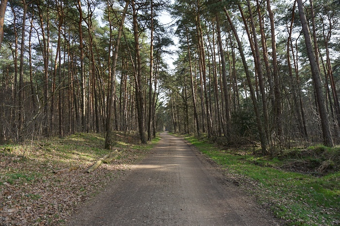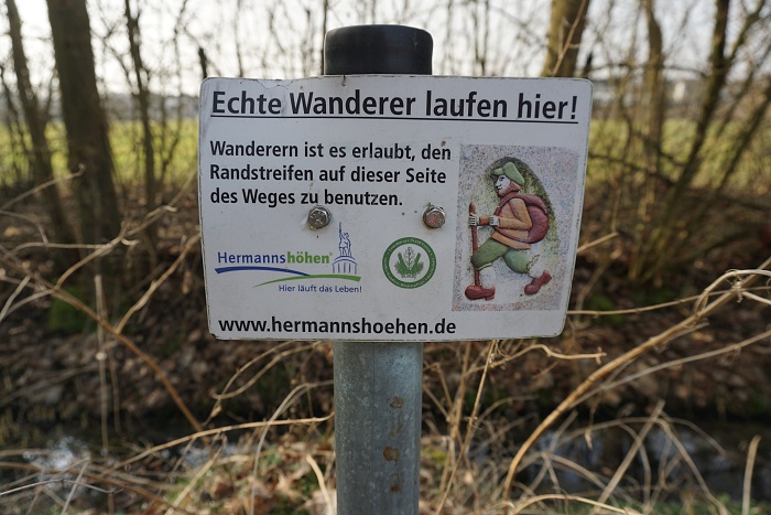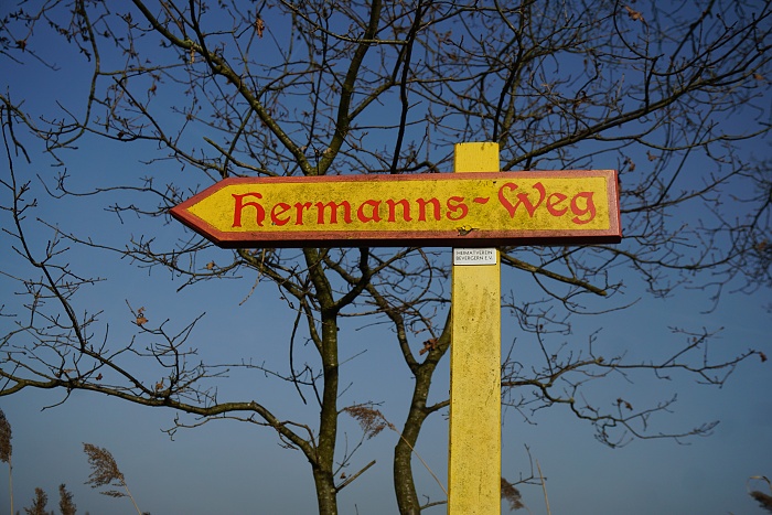 Durch ein weiteres kleines Waldstück hindurch erreichten wir schließlich ein rot-gelbes Schild, das vom Hermanns-Weg kündete.
