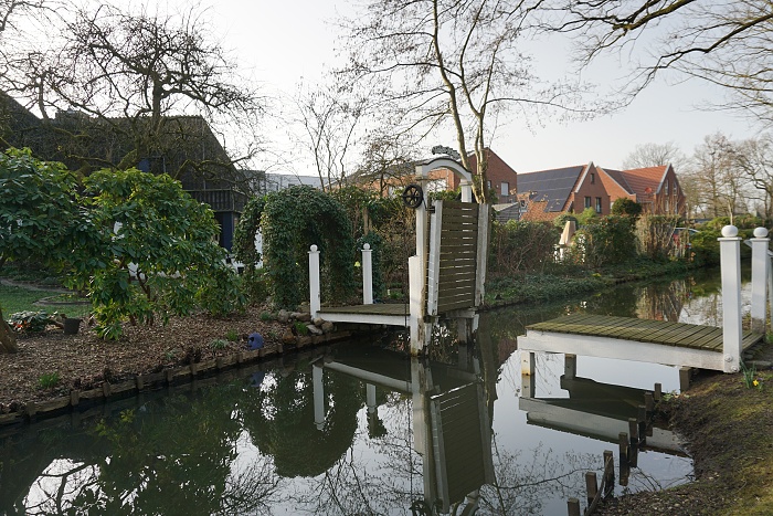 Der Abschnitt in Bevergern und entlang der Bevergener Aa ist der schönste Teil der Etappe. Der kleine Fluss ist richtig hübsch und urig. Hier war es dann auch prompt rappelvoll bei dem ausnahmsweise schönen Wetter. Das kann man aber auch niemandem übel nehmen. Eines der Häuschen hier hat sogar eine eigene kleine Zugbrücke über die Aa. So niedlich! Ich finde, es sollten viel mehr Häuser eine eigene Zugbrücke haben. Das hat Stil!